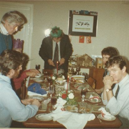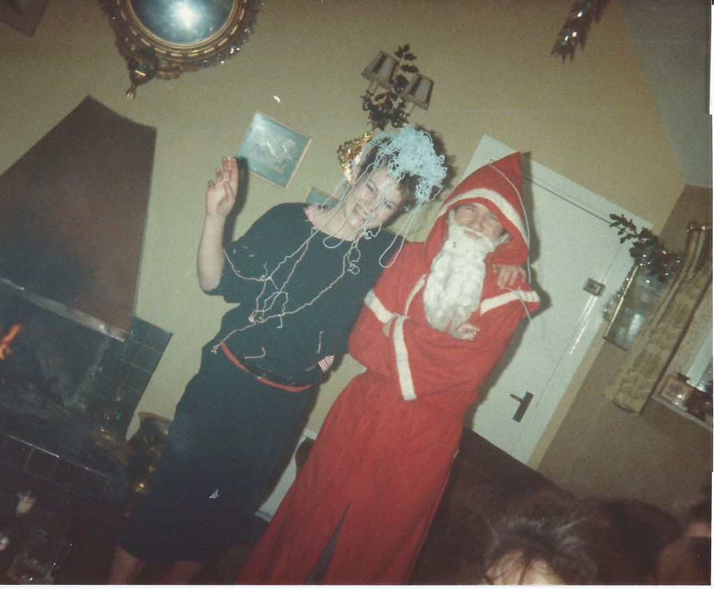 New Year’s Eve was always massive at Elm Cottage where we lived. With so many of us, the house was full of all ages, partying. My Dad played the bagpipes on the village green and hundreds of locals would gather to dance or stagger round the tree at midnight. He would then lead them into the Rose and Thistle pub, sneak out the back door and return the the party at ours. My parents and their friends sang, talked and drank until the wee small hours. Records played in other rooms, me and my friends, my siblings and theirs. All meeting up in the kitchen at various stages or wandering into other rooms and meeting new people.