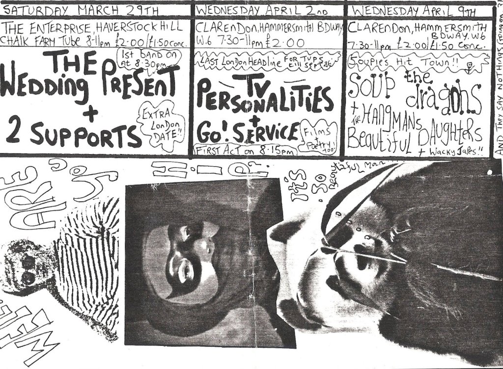 Such simple, handwritten fliers. Dan Treacy and his girlfriend, Emily, were starting to put nights on in various parts of London now. I love that on our gig with his band, the T.V.Personalities, there’s a flurry of beatnic psychedelia with the addition of films and poets.