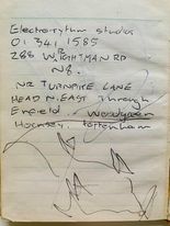 Dave – ‘So, I’ve been thinking: I believe that there were two diff Electrorhythm‘s. We recorded the Like An Angel EP at the first one Aug 1985, it was on Wightman Rd (directions scribbled in my original 1985 diary, pictured). It was just one room (with a small iso booth) .. the mixing board was in the same room as where the band played. I remember Andy Winters telling me that the next time he went there it had moved, not too far away, and was still small but actually had two rooms.’