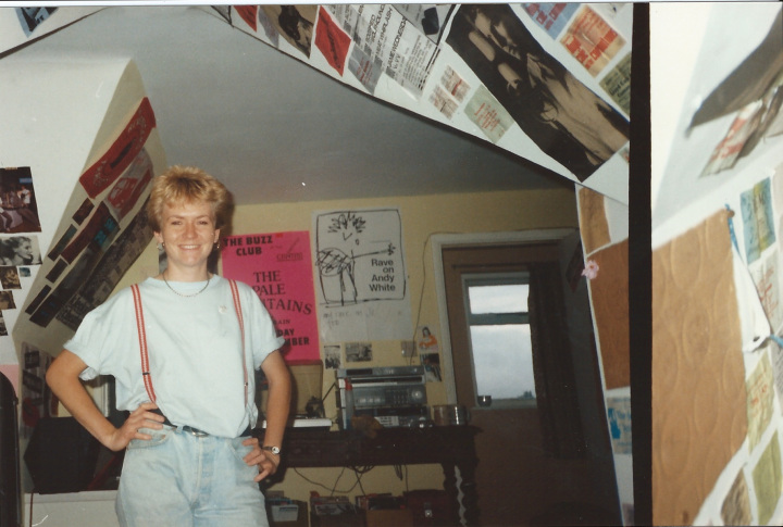 For ages I didn’t have a flier in my collection from this night (I used to hand them all out or get them displayed on local Our Price counters), so this photo was the only evidence I had – see the wall behind me (plus all my gig tickets, now sadly long gone, all around).