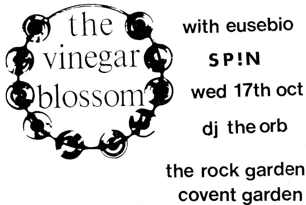 Danny was working at Cherry Red Records and had been given tickets to see Everything But The Girl at the Hammersmith Odeon. Another Cherry Red artist, Lawrence from Felt came with us. I love Lawrence, he has a very dry, very funny, sense of humour. We had a great night. After we said our goodbyes, Danny and I headed over to the Rock Garden, where I had given The Vinegar Blossom another gig. This time with Brighton’s Eusebio who had stood in when Flowered Up cancelled at The Buzz Club a few months earlier. Spin, (who later became Gene, it’s a complicated story though) were headlining. Plus, look at the d.j. – The Orb! Quite a good line up!
