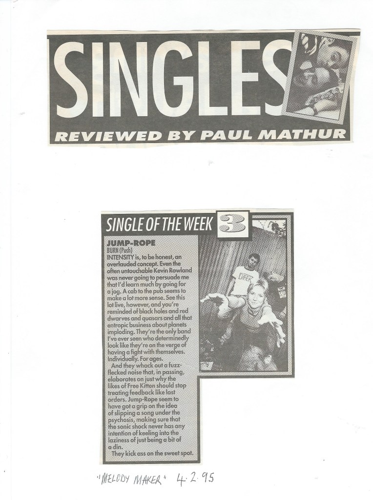 I got pro active pushing jump-rope. Being a press officer and radio plugger by trade, I knew how to go about getting things moving at an early stage for a band. The 7″ single releases had been the start of this. We got mentioned in the music papers – an On piece in the NME, live reviews and singles reviews in both the NME and Melody Maker.