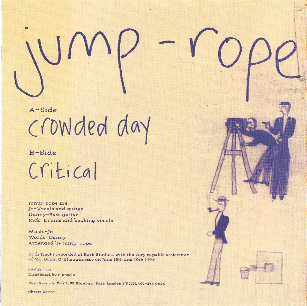 Having trimmed down from a four piece a few months previously, we changed the name from Poise to jump-rope and played our debut gig as a three-piece at The Marquee about a week later. We set up a label, got a distribution deal and released two 7″ singles. ‘Crowded Day’ was the first, both were recorded at Bark in Walthamstow, E17 at the end of 1994. ‘Crowded Day‘ had been played by Jo Whiley and Steve Lamacq on their Radio 1 Evening Session, so I was pleased with how things were going.