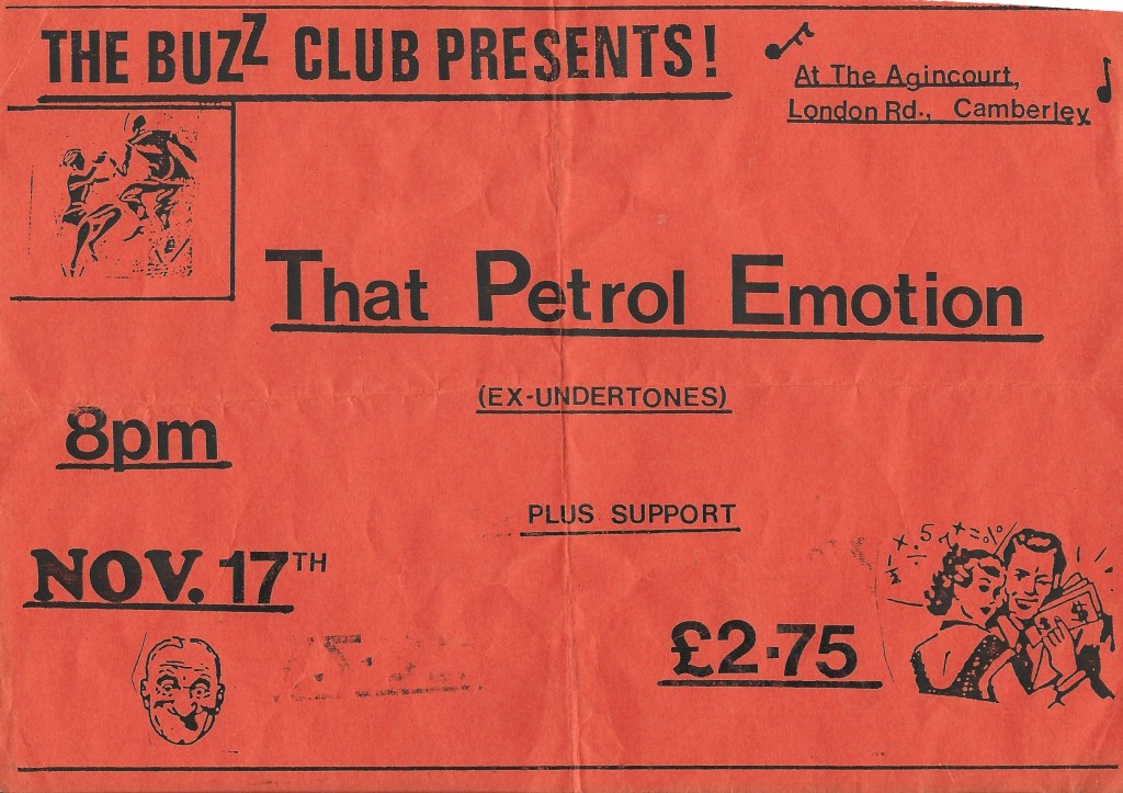 This poster is from the first ever one – That Petrol Emotion and The Mighty Lemon Drops at The Agincourt in Camberley, Surrey 17th November 1985. We used to get the posters done by Publicity and Display in Goldalming – we saw that’s where the proper promoters got theirs made and we always wanted to be ‘proper’. We would paste them up ourselves on closed down shops where all the other venues were pasting theirs, a bucket of wall paper paste and a broom in the back seat of Danny’s Mini.