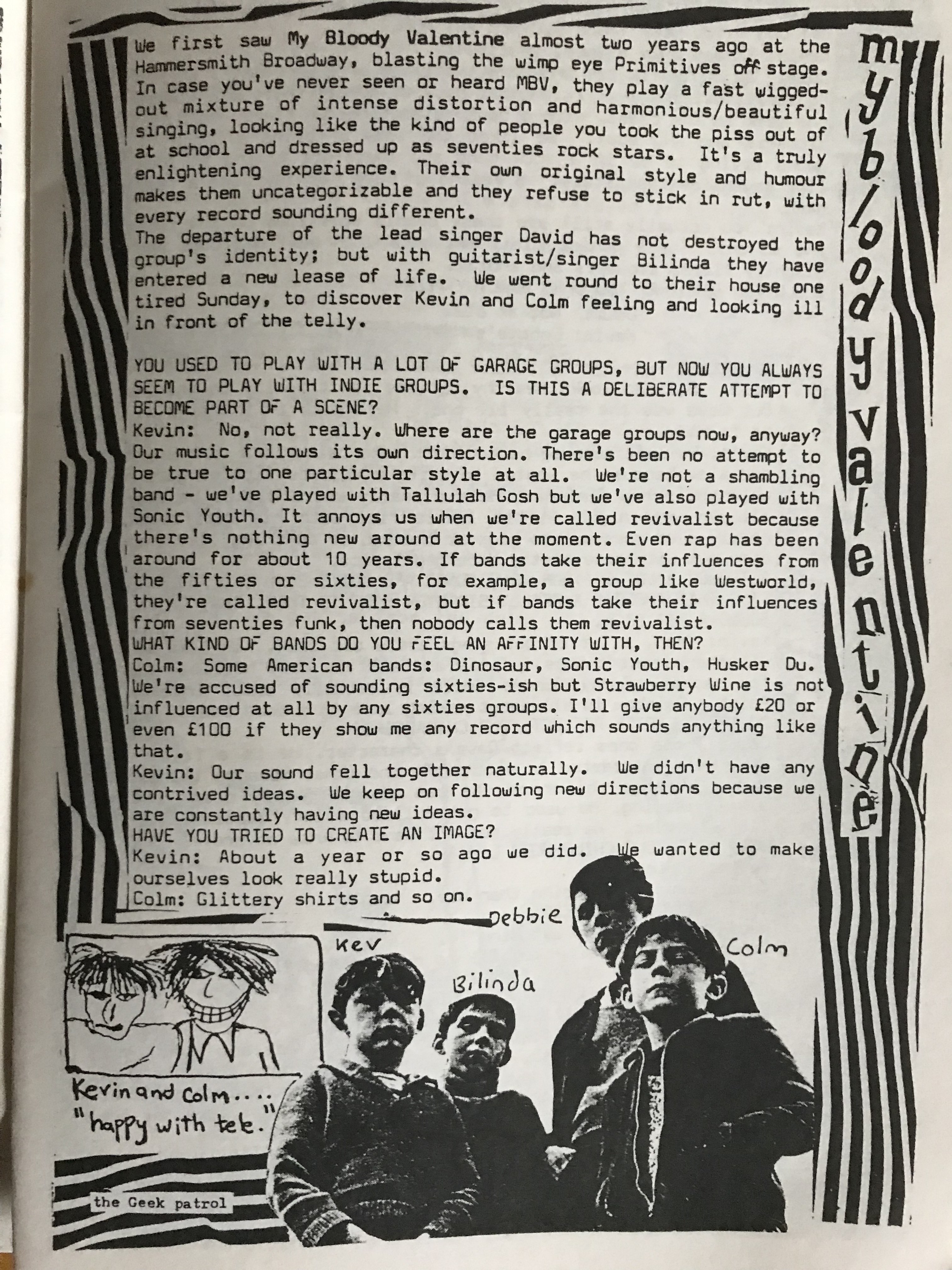 Will has very kindly sent me another great interview from the one and only edition of his ‘Make It In Ongar’ fanzine – this time with My Bloody Valentine. Will says the , erm, ‘breaking wind’ references are due to his being ‘a very immature 17 year old’.