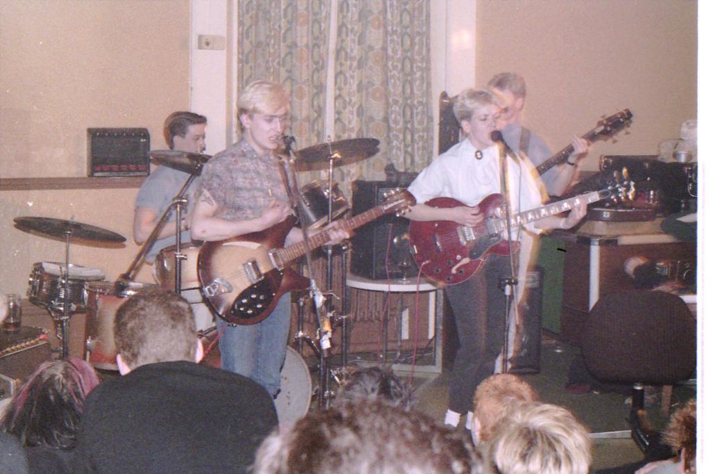 I was always making compilation tapes, for the car or my tape player in the mini bus, on the way to gigs. We started to play regularly at The Room at The Top, above The Enterprise pub in Chalk Farm. Nights that Dan Treacy was organising. Here we are supporting his band, The Television Personalities at The Room at the Top, Rudy is playing his lovely Rickenbacker. Mine is a Maya semi-acoustic.