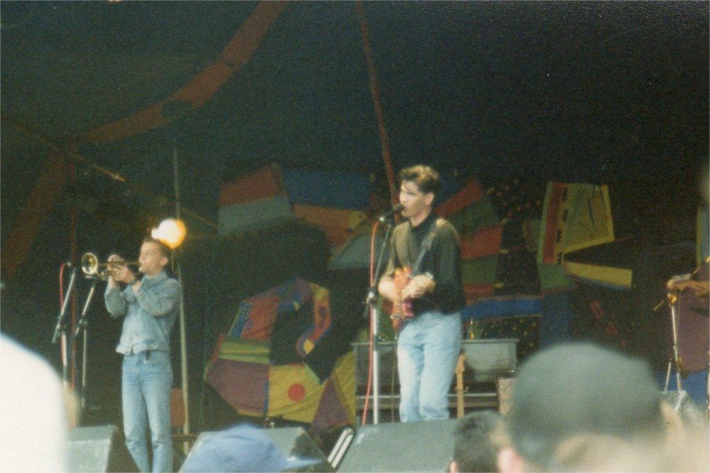Day two: Walking around shell shocked. Saw The Weather Prophets. Mark, our new guitarist had travelled down separatley and was camping with his girlfriend. We found him. We went to the cinema tent and asked who was next on ‘Bluetrain, but they’re not here yet’. ‘That’s us!’ ‘Well hurry up, you’ve got 45 minutes before you’re on!’