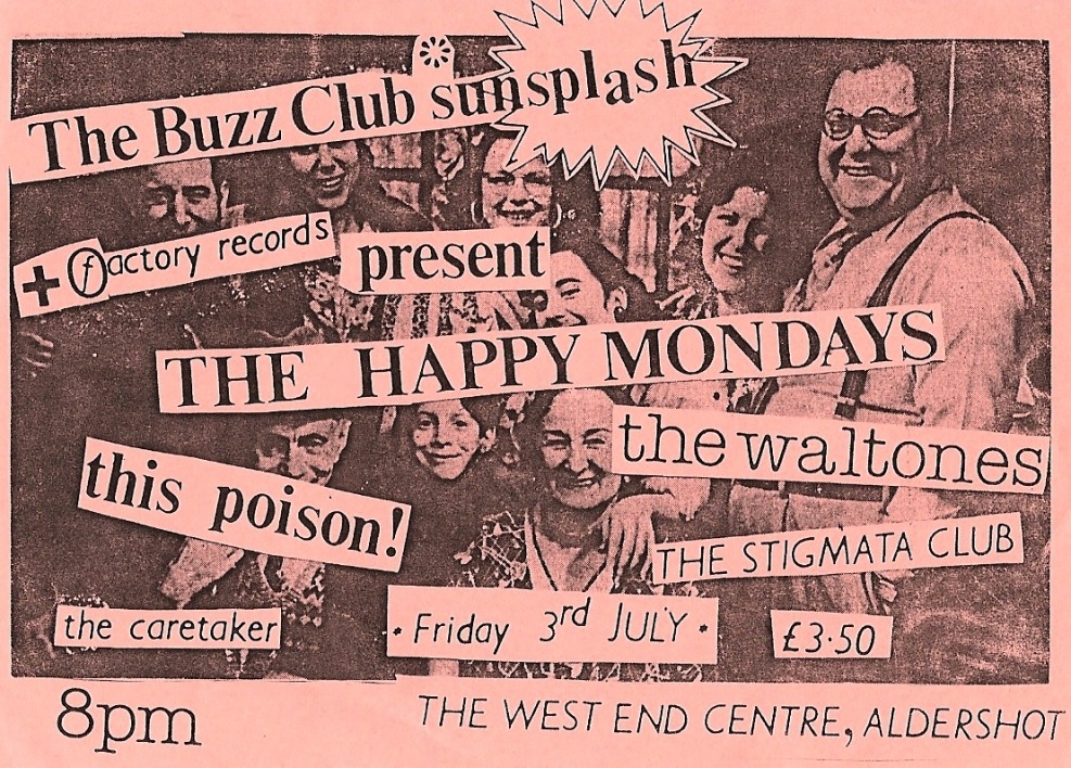 It was a hot summer evening on the 3 July 1987. It was also a Friday – we usually had the Buzz Clubs on a Saturday. No one had really heard of the Happy Mondays yet and so, not many people turned up. I think about 30 or so. I remember sitting on the steps outside the West End Centre and looking down the street, realising that no one else was coming. At that stage it was a bit of a blessing as the band themselves hadn’t turned up yet. They were about three hours late. I have a feeling, since neither of the main support acts were there, once the Mondays were there and sound checking, they just kept playing and it turned into the gig. I also remember being pretty scared of them. Southern softies that we were. I hadn’t really ever come across anyone like Shaun Ryder or Bez before. Probably haven’t since to be fair.