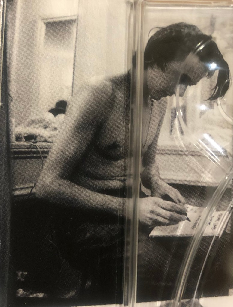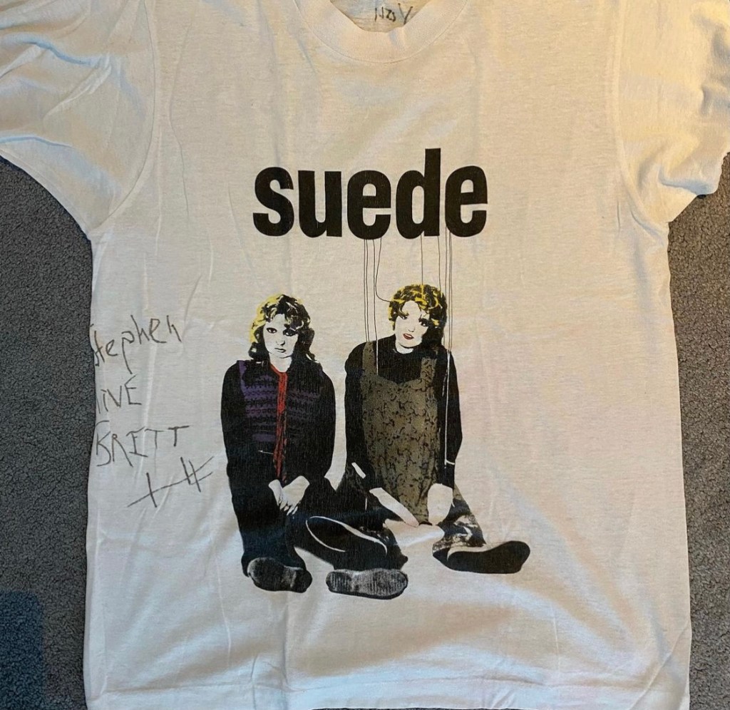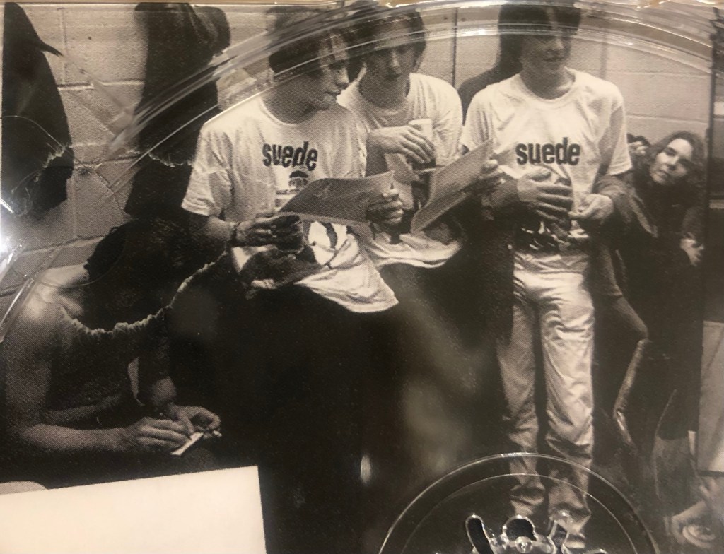 These photos of Brett signing tee shirts and flyers, back stage at their Buzz Club gig were found under the clear tray on a Suede Best Of CD!