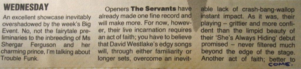I’d called a sickie at work for that Liverpool gig. A guy at work was buying my Cortina and knew the band were off to Liverpool. He’d forgot though and came looking, the office said “He’s not in today” and he said “Oh, his band are playing in Liverpool” so I was rumbled. In July supporting Felt in Oxford, some kids asked us to sign copies of our single. By this time David’s songwriting was really strong and he was getting known in his own right as an up and coming talent. Maybe folk were whispering in his ear, or maybe he was struggling to keep it all under control but either way the band dynamic was changing more into David Westlake’s Servants. I liked David and still trusted him though.