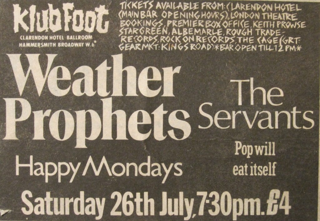 26/7 Claredon Hotel, W6 – Weather Prophets, *, Happy Mondays, Pop Will Eat Itself
