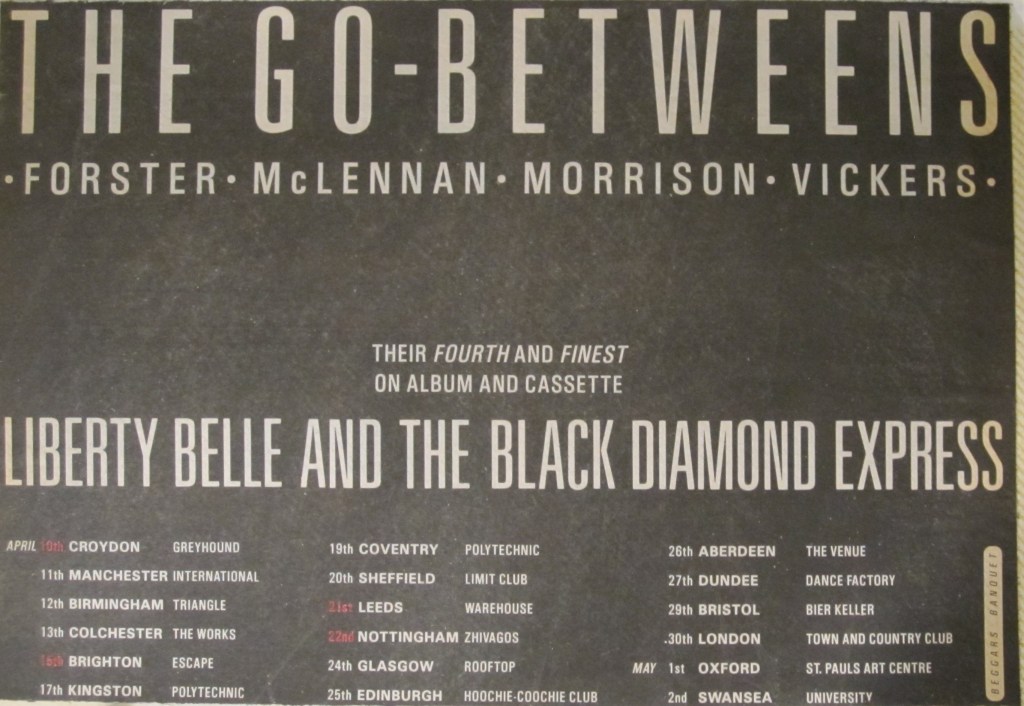 April brought four support slots on the Go-Betweens promotional tour for ‘Liberty Belle and the Black Diamond Express‘ – that album was fantastic and the Go-Betweens played with a style and beauty that took your breath away. Robert Forster had star quality, he sang his lyrics with a rakish guile and his delivery pulled you in, Lindy Morrison was a star too in my mind, sometimes people just have an aura about them and she did. Grant McLennan was witty, he and Robert were great foils for each – a double act indeed while Robert Vickers played excellent bass, smiled and didn’t bother to complete for the already thinly-spread limelight.