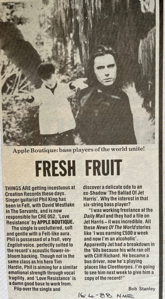 Phil was playing bass with Felt, Alan McGee’s Biff Bang Pow and the Hangmans at the same time and knew Alan McGee well so we got the chance to record a single on Creation in May without actually being a band yet. Phil played bass, rhythm guitar and vocals, me on lead guitar and keyboards, Owen Seymour (Summerhill) on drums, and Emily Brown (Hangmans) on backing vocals. Emily had a voice that could rock or sing a lullaby, she seemed friendly and knew Phil well from the Hangmans. The recording was in Alaska Studios underneath Waterloo railway arches. Phil’s songs sounded great I thought and the production preserved the feeling of the songs and left them uncluttered.
