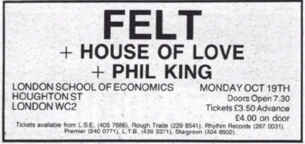 We played one gig that year supporting Felt on 19th October at the LSE, London. There was a rumour that Felt needed a guitarist for a tour in Europe so I learned the guitar to the ‘Forever Breathes‘ album but the call never came.