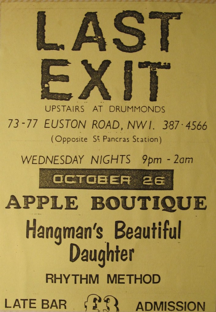 Our gigs mainly covered the Camden/Euston area, a flourishing circuit of venues. Apple Boutique were back at the band starting gate, playing songs nobody was familiar with and with no reputation to precede us.