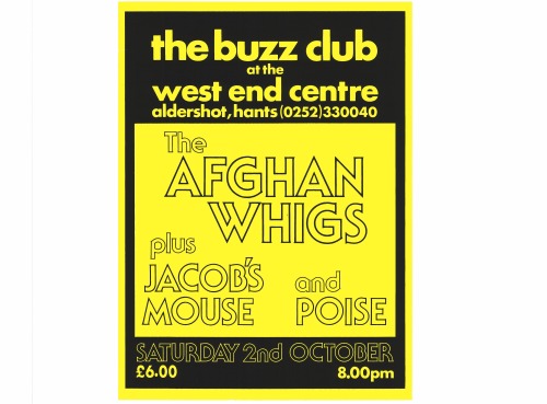 We rarely had cancellations at The Buzz Club, twice I think. Each time, frustratingly, we had just got the posters done. Afghan Whigs actually cancelled a few days before the gig. And so, on 2nd October 1993 the only band on the poster who played was my own band Poise. I can’t remember why Jacob’s Mouse also cancelled, but they did.