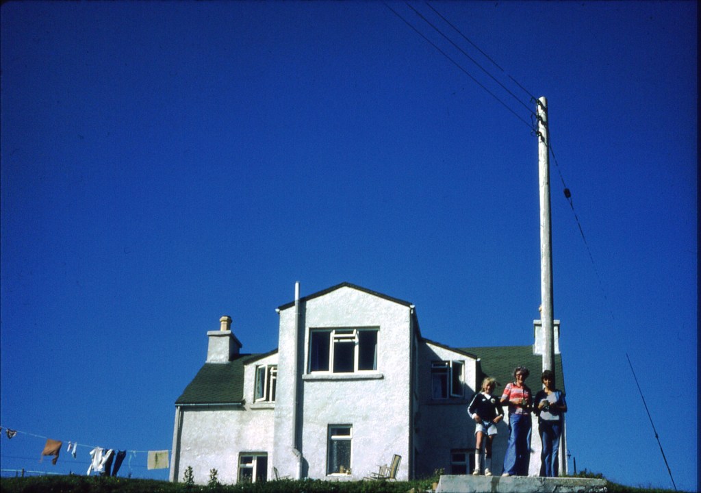 Me, mum and Moira Baird standing on the septic tank, outside the Harbour Cottage at Ault on Barra. Me in my Umbro Scottish top worn with my cut off denim shorts.