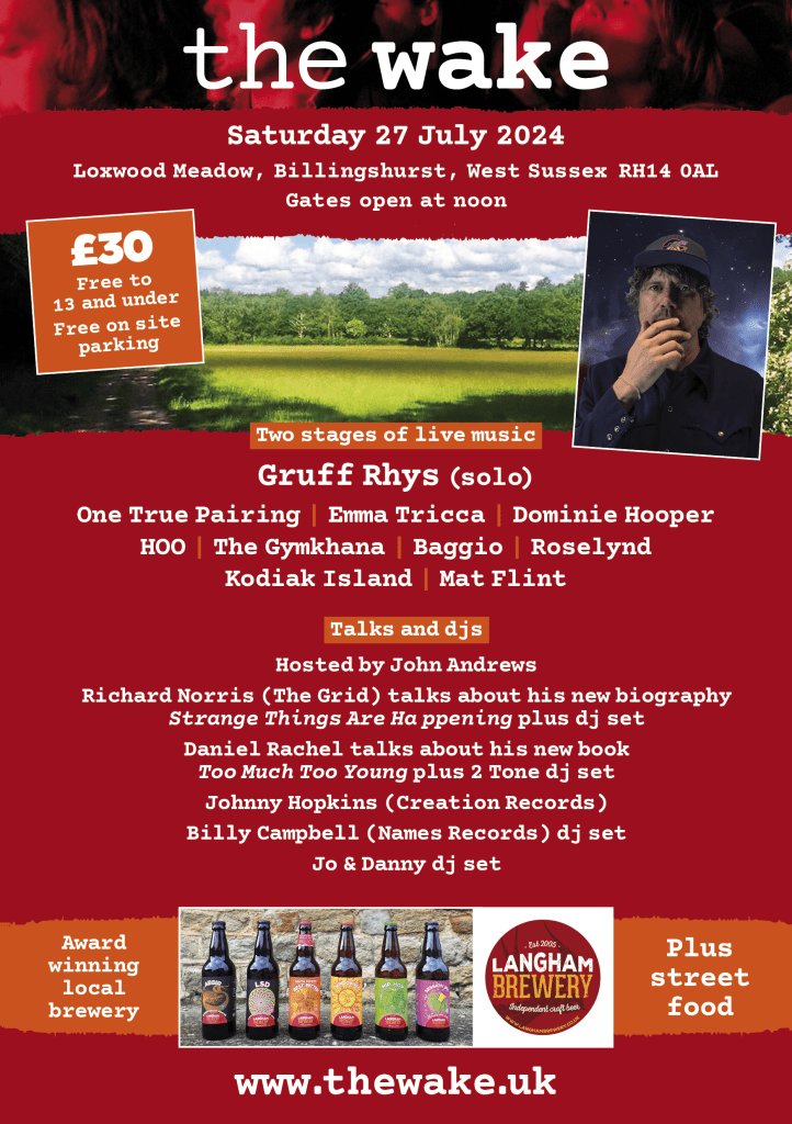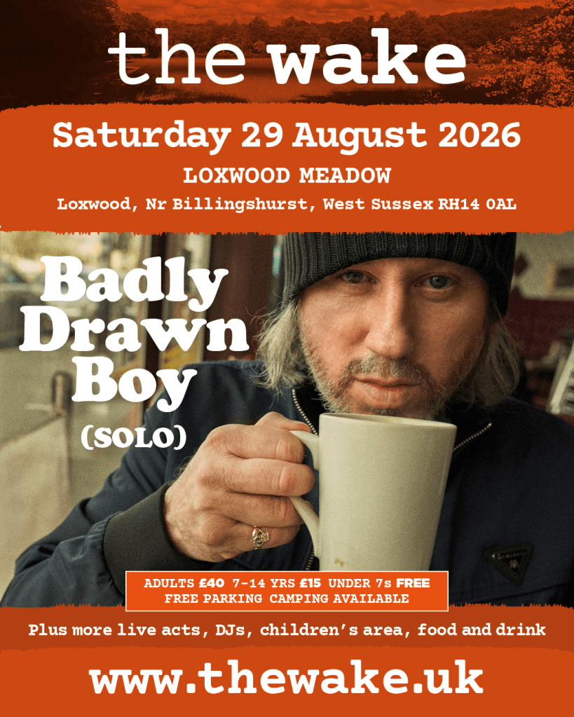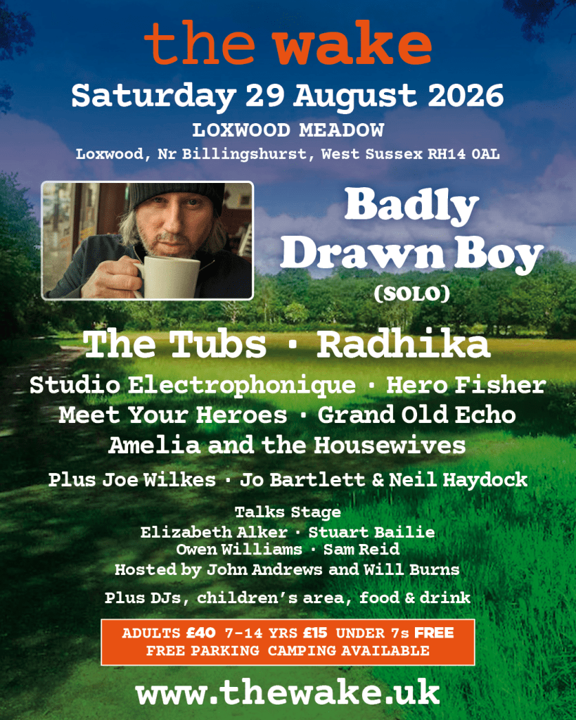 In 2024 Danny and I started The Wake in West Sussex, we sold out of tickets three months after we launched. Gruff Rhys headlined. In 2025 we increased in size slightly, still super small, and added camping. We sold out at the end of July. On Saturday 23 August The Wake took place and it was wonderful. The Wake 2026 is on Saturday 29 August, with Badly Drawn Boy headlining.